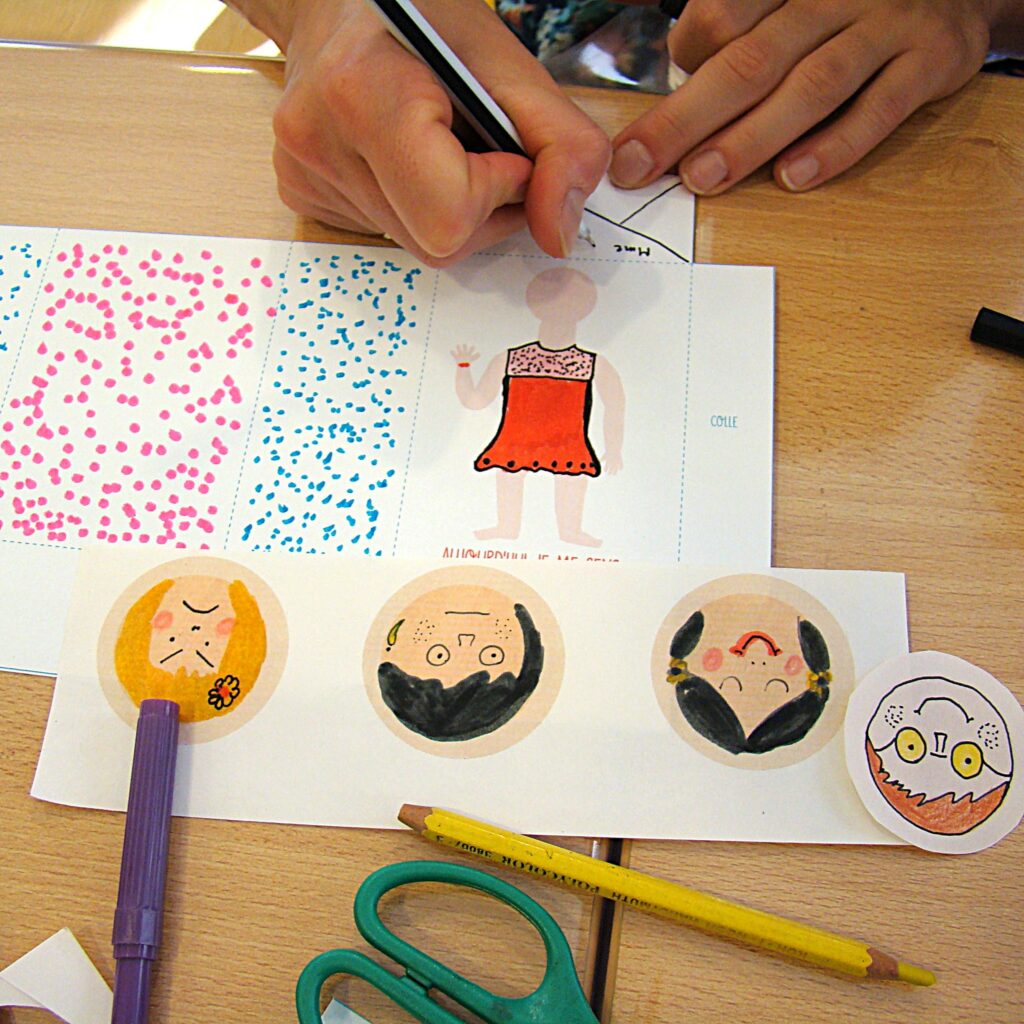Réalise un ou plusieurs badges selon ton humeur du moment. Pour commencer, on dessine, ensuite on met les couleurs à l’aquarelle, on découpe et pour finir on fait carburer la machine à faire des badges !